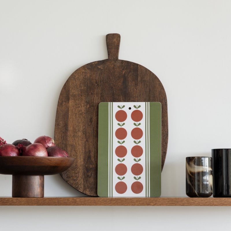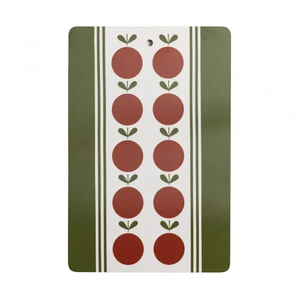 Frukt och kako (tõlkes puuvili ja kook) muster toob esile nostalgilise jõulutunde – punased õunad, piparkoogid ja soe talvine meeleolu. Kasuta seda juustuvaliku serveerimiseks, kohvipausil või kaunistusena köögitasapinnal. Lihtne puhastada ja suurepärane kingiidee!