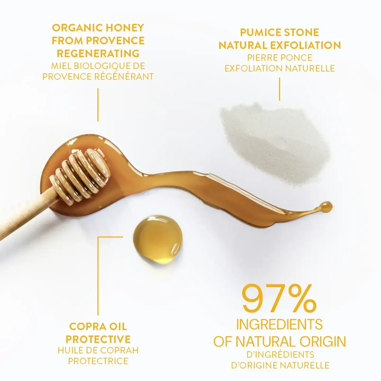 Kooriv vedelseep, mis ühendab endas Marseille’ seebitraditsiooni ja õrna igapäevahoolduse. Suurendatud rasvasisaldusega (superfatted) koostis puhastab nahka õrnalt seda kuivatamata, peeneks jahvatatud pimsskivi osakesed koorivad nahka delikaatselt, aidates eemaldada surnud naharakud ja muutes naha siledamaks ja pehmemaks. Mesi lisab hooldava ja taastava puudutuse, jättes naha mõnusalt pehmeks ja kenasti hooldatuks.